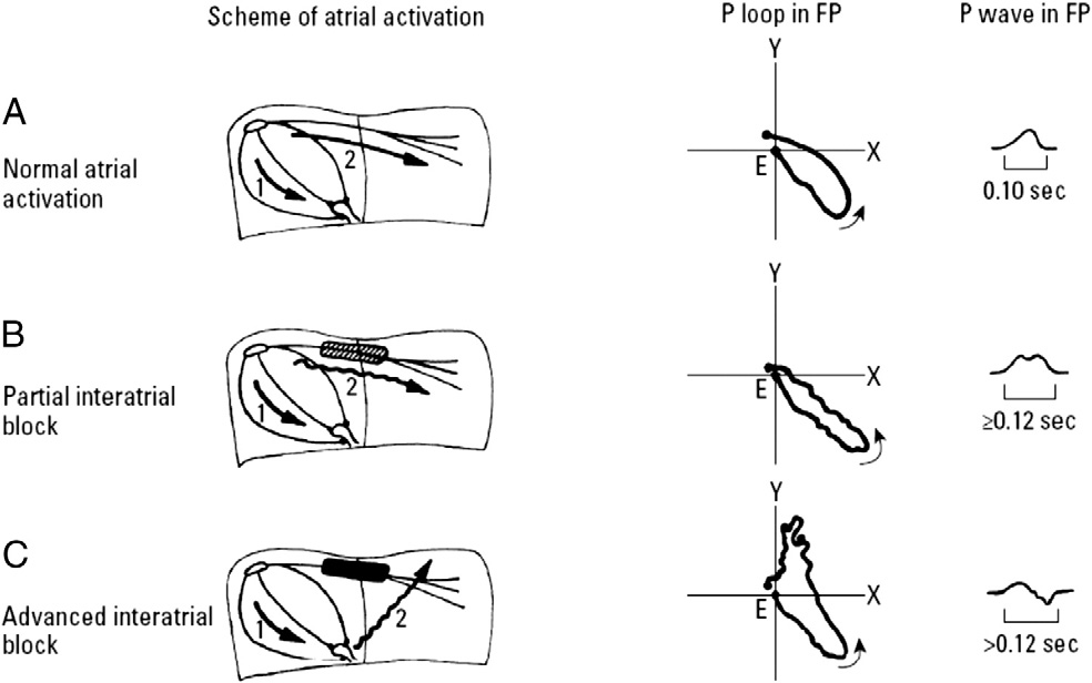 Esse conceito foi elegantemente sistematizado por Bayés de Luna, que demonstrou que os padrões clássicos de onda P longa — isolada ou com morfologia plus-minus nas derivações inferiores — correspondem a diferentes graus de bloqueio interatrial, entidade distinta da sobrecarga atrial esquerda.